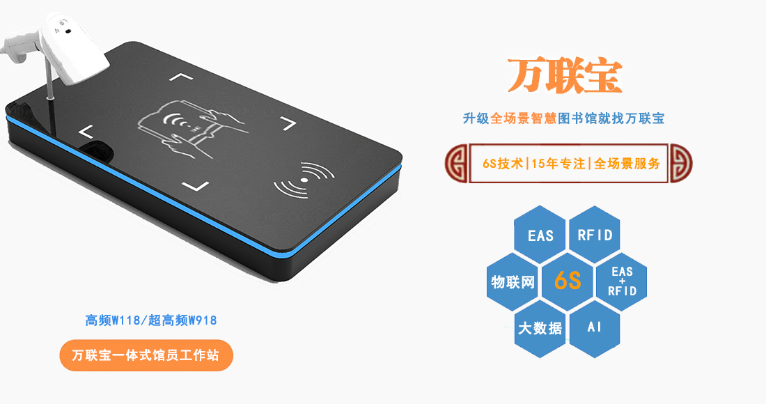 萬聯寶高頻iAiot-W118/超高頻W918一體館員工作站表面采用磨砂ABS效果處理、周邊藍光點綴設計,內嵌RFID讀寫器、身份證讀卡器、會員卡讀卡器、配置激光掃描頭,支持超高頻或者高超頻多標簽讀取,可作為一體式館員工作站使用,也可作為桌面自助借還機使用,主要用于圖書館、資產管理等場所。