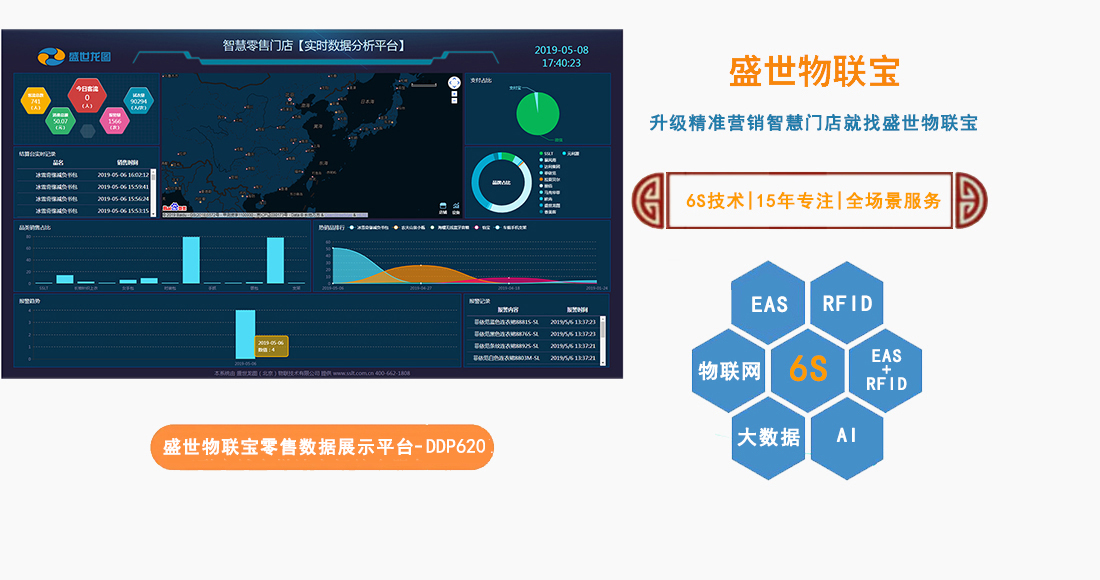 DP620盛世物聯寶零售智慧門店數據展示平臺通過智慧門店內閉環智能硬件終端數據采集,整理、分類,進而實現基本的數據分析,包括:銷售分析、客流分析、喜好分析、結算分析、報警分析等。管理者可直觀通過數據展示平臺數據,為管理者提供基于數據決策。