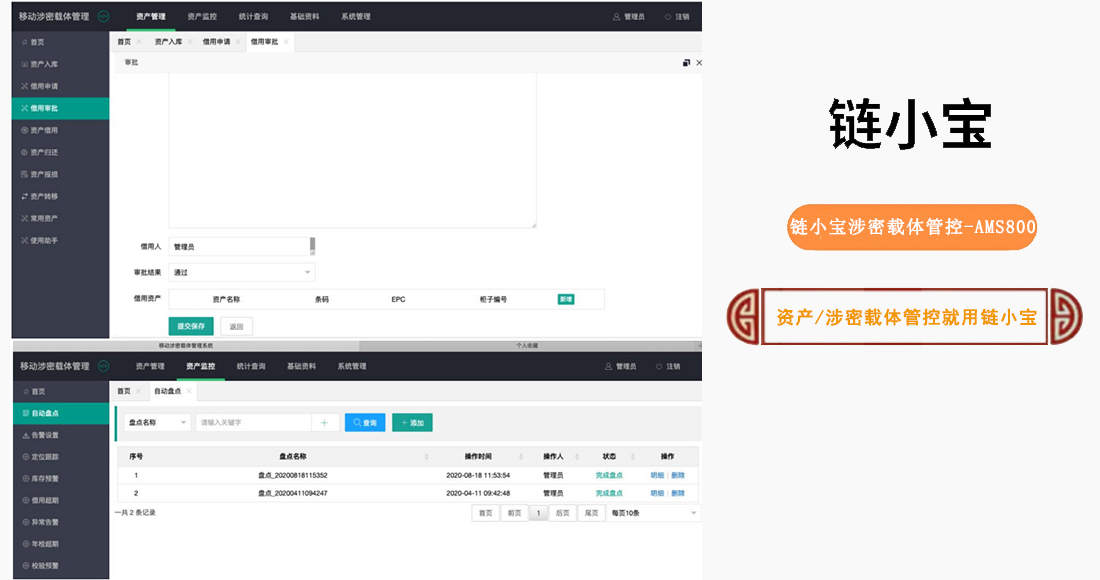 鏈小寶iRFID-AMS800涉密載體管控平臺由涉密移動載體智能管控系統(tǒng)、RFID智能柜系統(tǒng)、門禁出入識別子系統(tǒng)三部分組成。主要實現(xiàn)涉密載體的審批、自助借還、智能防盜、智能盤點等功能。