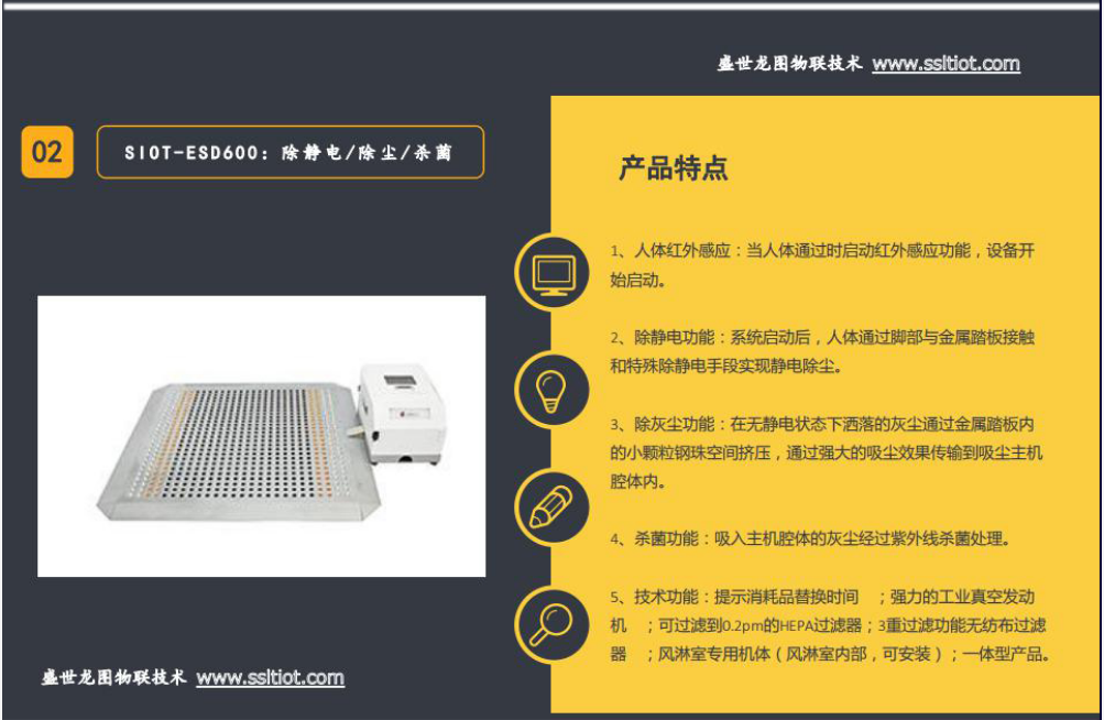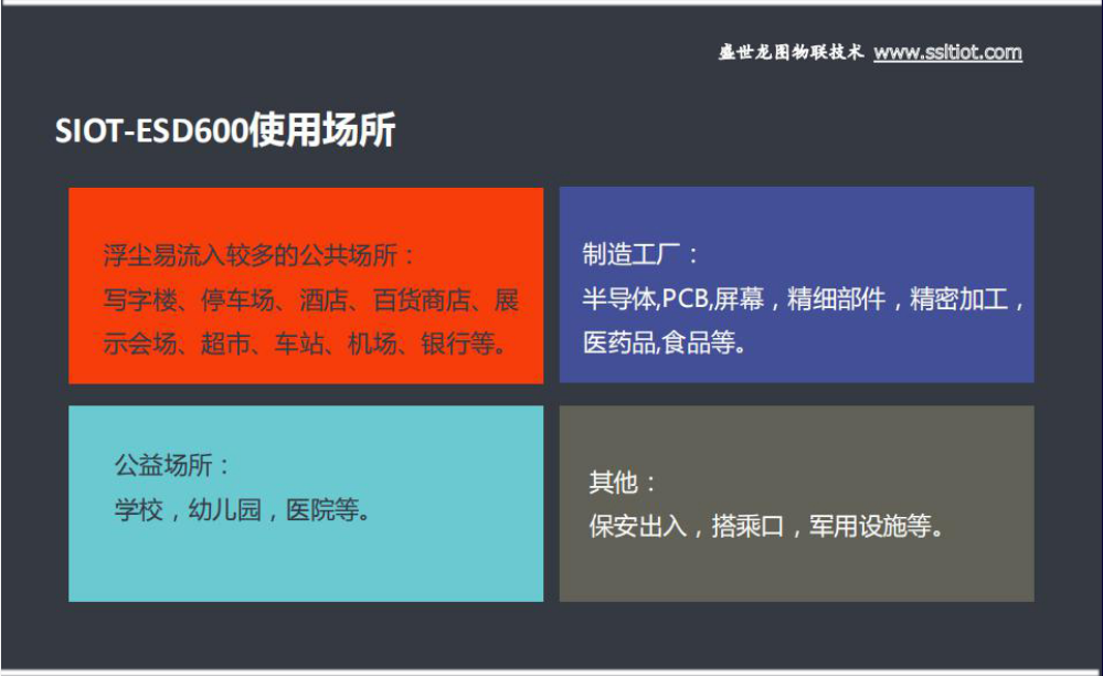 人類正享受著便利的生活,但是,周邊環境也正逐漸隨此被污染。空氣中肉眼看不見的有害物質:霧霾,黃沙, 被稱為超細微塵的PM2.5的臭氧,亞硫酸酬一氧化碳,二氧化氮...ESD600智能除靜電、除塵、殺菌,適合芯片企業、科研、部隊、圖書館、博物館、銀行、機場、地鐵等場景。