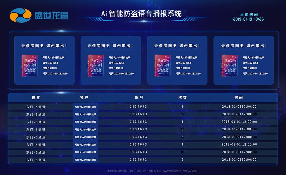 4、針對EM設備:大屏不顯示報警產(chǎn)品名稱只顯示報警通道號和次數(shù);RFID安全門:可大屏顯示報警圖書的名稱、通道號、時間、次數(shù)等;