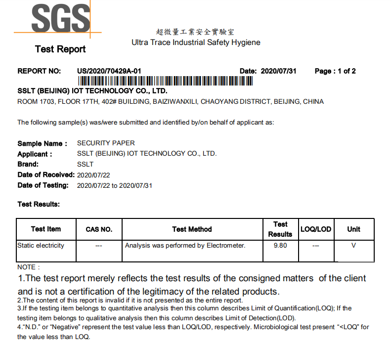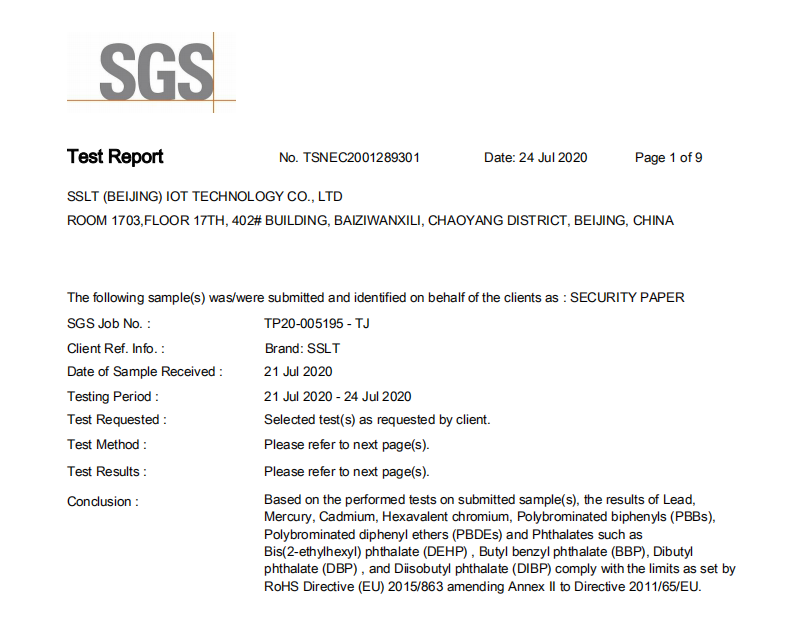 2020年8月,盛世龍圖旗下資控寶SAP06金屬保密紙通過歐盟ROHS安全認證,并取得靜電測評檢測報告。
