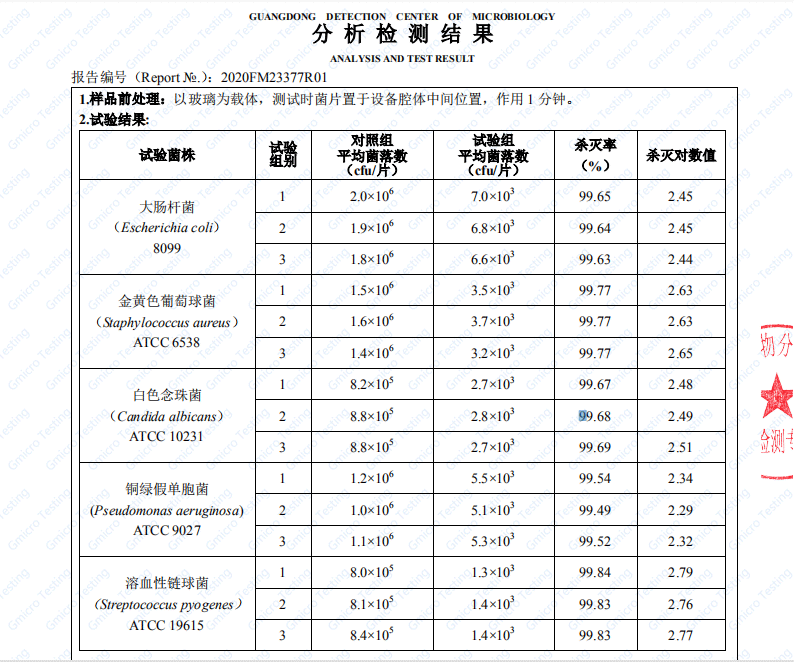 本次檢測菌類:H1N1、大腸桿菌、金黃色葡萄球菌、白色念珠菌、溶血性鏈球菌、枯草芽孢桿菌、綠膿桿菌、鼠傷寒沙門氏菌、表皮葡萄球菌、銅綠假單胞菌。